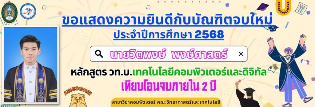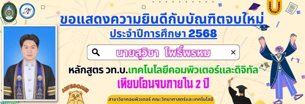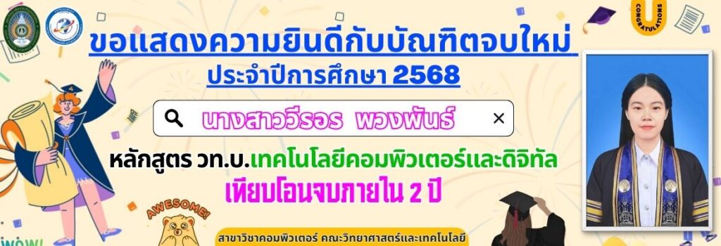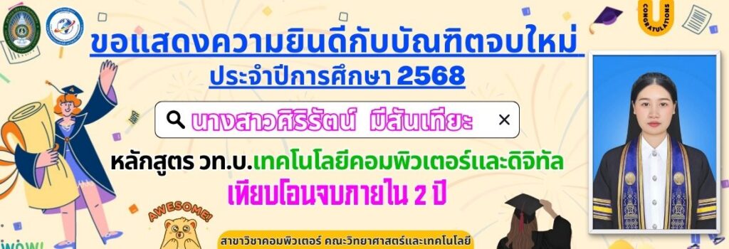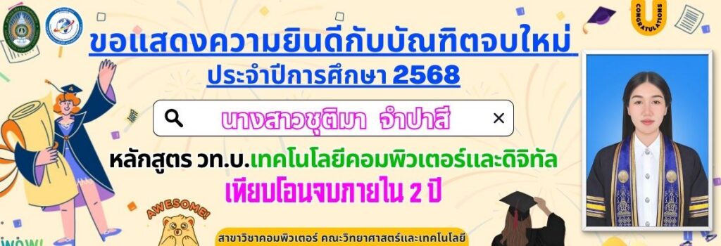 ขอแสดงความยินดีกับบัณฑิตจบใหม่ ประจำปีการศึกษา 2568 หลักสูตร วท.บ.เทคโนโลยีคอมพิวเตอร์และดิจิทัลเทียบโอนจบภายใน 2 ปี
